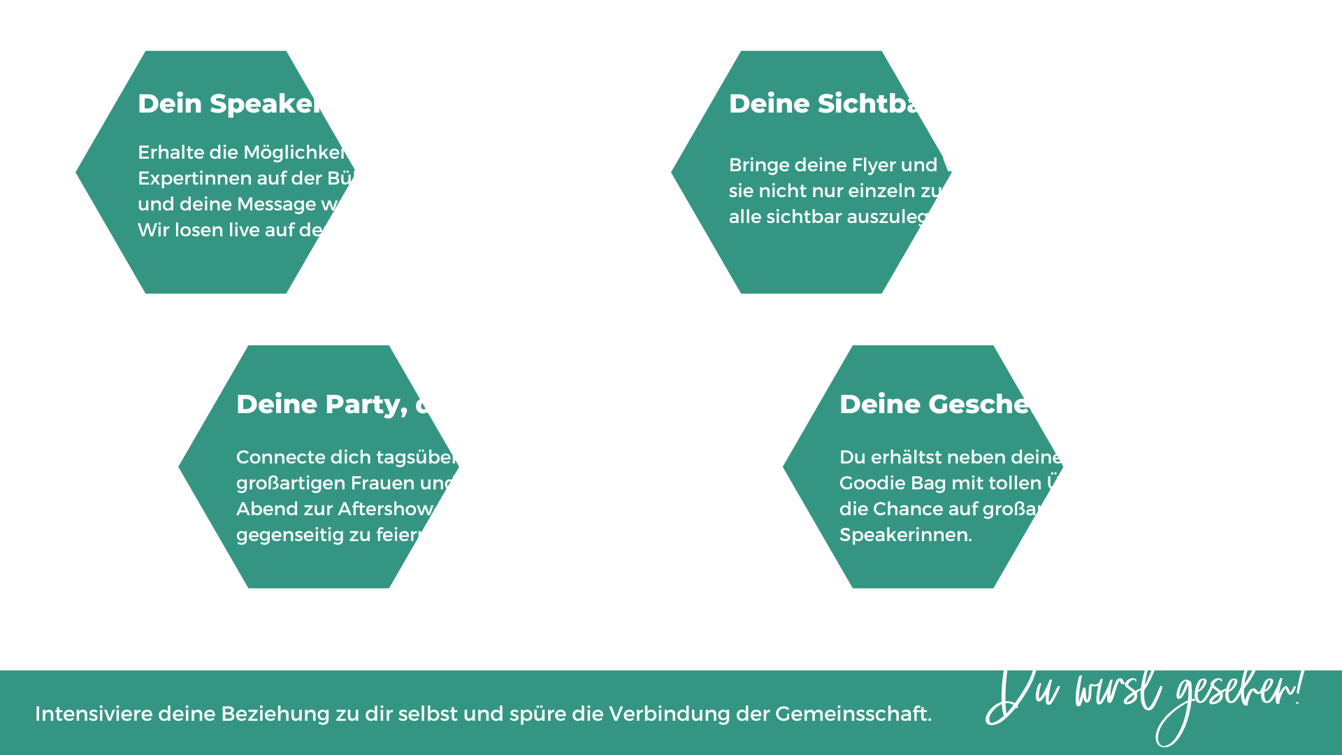 Genau deswegen geben wir auch dir die Möglichkeit, deine Message auf der Bühne zu teilen und in die Sichtbarkeit zu kommen.